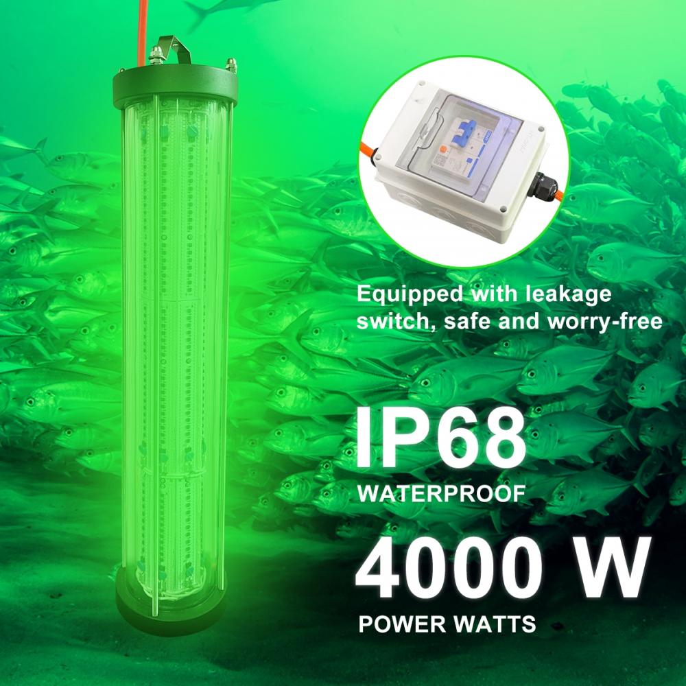 - High-performance 4000W green LED fishing light, ideal for attracting large fish like salmon and squid, with IP68 waterproof rating for underwater use.