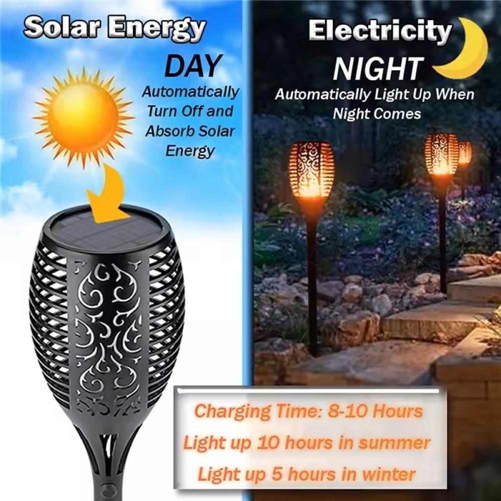 - Illuminate your garden with realistic flame-like LED lights powered by solar energy.