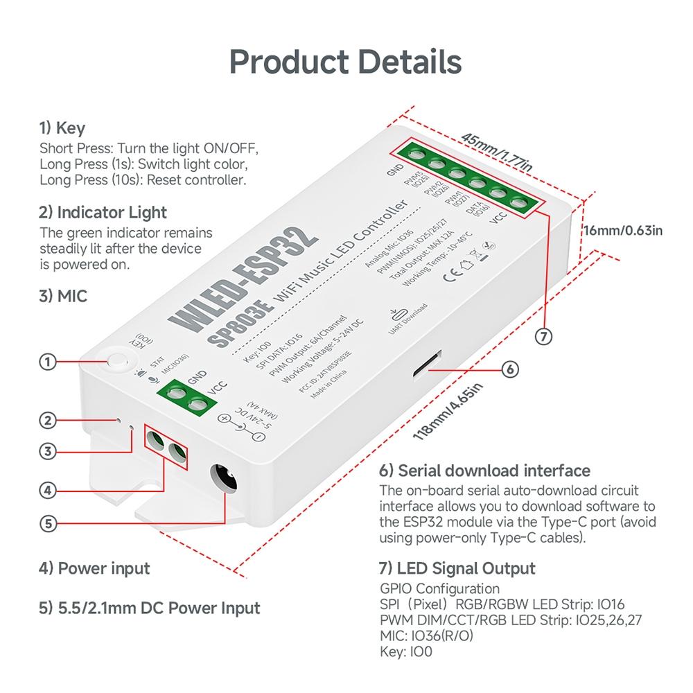 This LED controller combines WiFi connectivity and music synchronization to bring your lighting to life. Designed with ESP32 technology, it supports smart home integration and is compatible with various LED types for versatile use.