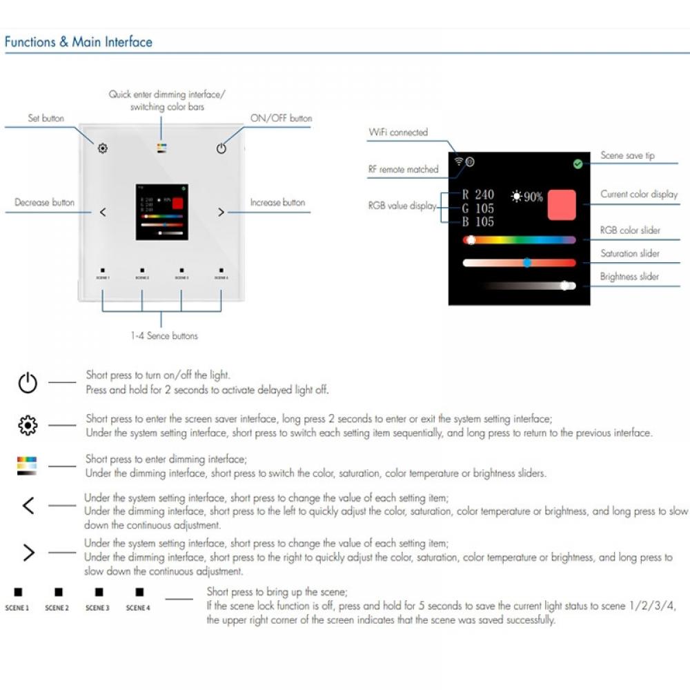 This touch panel LED controller combines WiFi and RF control for seamless lighting management. Designed for versatility, it supports single color, color temperature, RGB, RGBW, and RGB+CCT lights